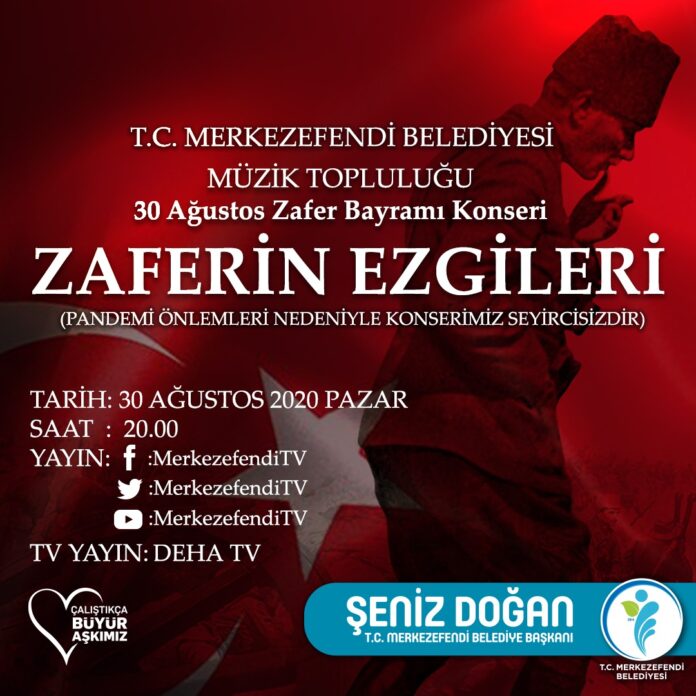 ZAFERİN EZGİLERİ KONSERİ Merkezefendi Belediye Başkanı Şeniz Doğan, 30 Ağustos Zafer Bayramı’nı büyük bir coşkuyla kutlamak için hazırlandıklarını söyledi. Başkan Doğan, “Tarihin altın sayfalarındaki yerini alan ve bağımsız yaşamak isteyen birçok ulusa da yol gösteren Kurtuluş Savaşı, Türk milletinin, ordusu ile birlikte yüce Atatürk’ün önderliğinde yazdığı kahramanlık destanıdır. Bu büyük zaferin 98.yıldönümünü ilçemizde büyük bir coşkuyla kutlamak için hazırlanıyoruz. İlk önce bando takımımız, belirlenen mahallelerde hemşerilerimize marşlar ve şarkılarla bayram coşkusunu yaşatacak, sonra Merkezefendi Müzik Topluluğumuz canlı yayında konser verecek. Pandemi tedbirlerine ve kurallarına uygun bir şekilde gerçekleştireceğimiz etkinliklerimiz ile hemşerilerimiz bayram coşkusunu yaşayacak” dedi.
